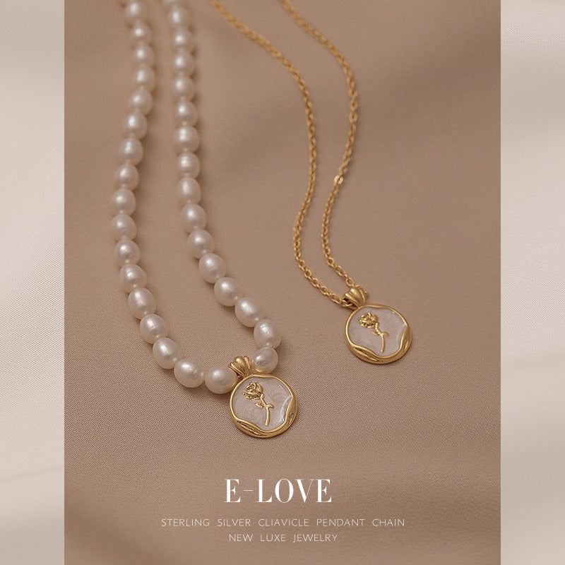 French Rose Vintage Sterling Silver Natural Pearl Necklace